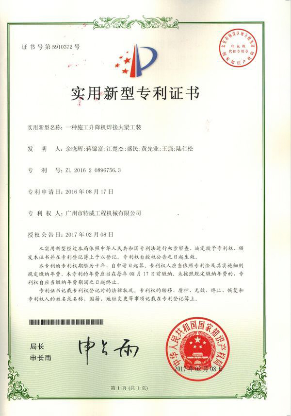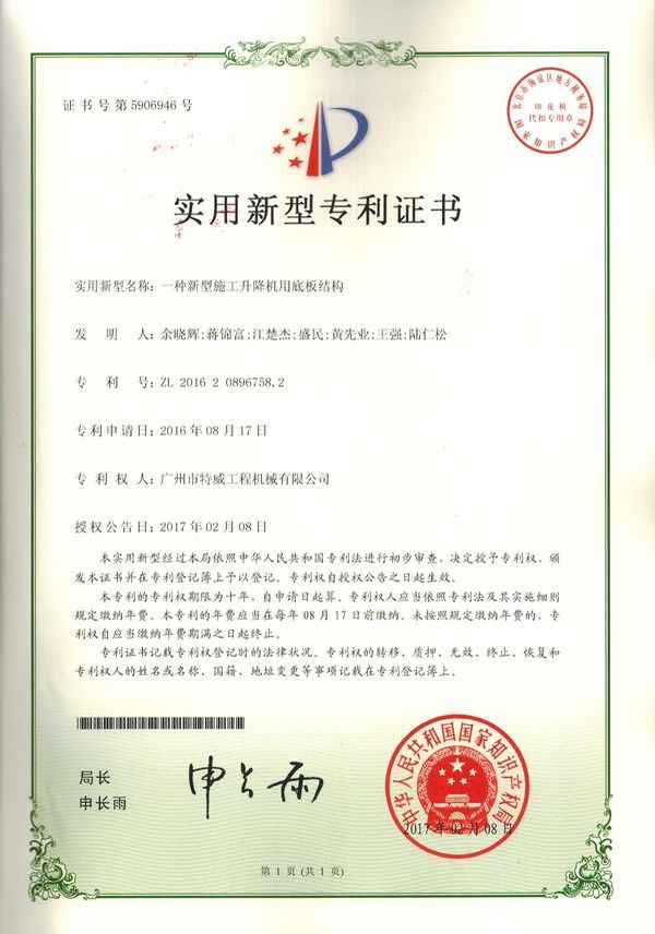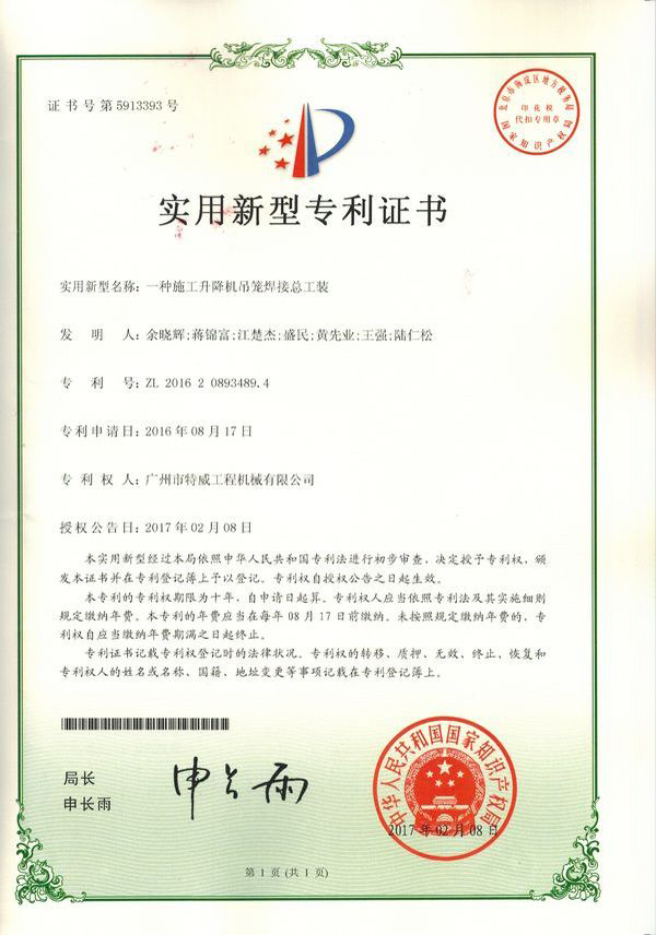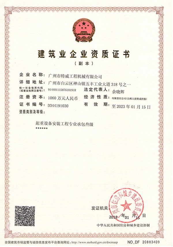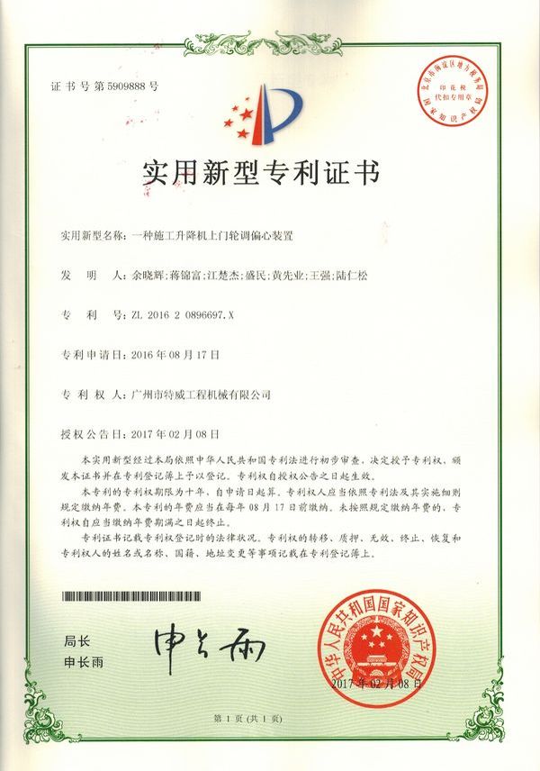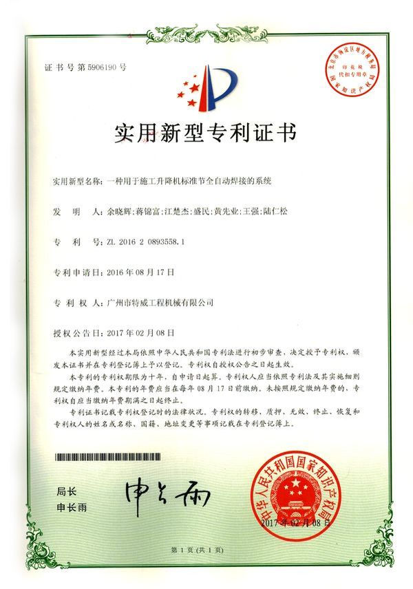 廣州市特威工程機(jī)械有限公司地處廣州市白云區(qū)神山鎮(zhèn),廣清高速神山出口附近,是一家施工升降機(jī)的專業(yè)生產(chǎn)廠家。公司成立于2011年,占地100000多平方米,注冊(cè)資金1060萬元,現(xiàn)有員工300余人其中工程技術(shù)人員33人,高級(jí)技術(shù)人員52人。